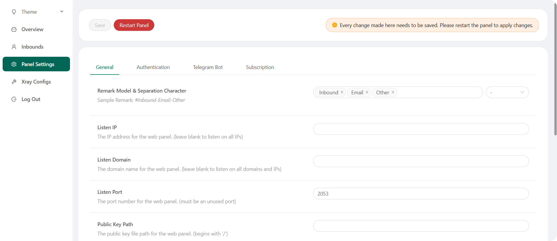 Haz clic para ver los detalles de la configuración predeterminada ### Nombre de usuario, Contraseña, Puerto y Ruta Base Web Si elige no modificar estas configuraciones, se generarán aleatoriamente (esto no se aplica a Docker). **Configuraciones predeterminadas para Docker:** - **Nombre de usuario:** admin - **Contraseña:** admin - **Puerto:** 2053 ### Gestión de la Base de Datos: Puedes realizar copias de seguridad y restauraciones de la base de datos directamente desde el panel. - **Ruta de la Base de Datos:** - `/etc/x-ui/x-ui.db` ### Ruta Base Web 1. **Restablecer la Ruta Base Web:** - Abre tu terminal. - Ejecuta el comando `x-ui`. - Selecciona la opción `Restablecer la Ruta Base Web`. 2. **Generar o Personalizar la Ruta:** - La ruta se generará aleatoriamente, o puedes ingresar una ruta personalizada. 3. **Ver Configuración Actual:** - Para ver tu configuración actual, utiliza el comando `x-ui settings` en el terminal o selecciona `Ver Configuración Actual` en `x-ui`. ### Recomendación de Seguridad: - Para mayor seguridad, utiliza una palabra larga y aleatoria en la estructura de tu URL. **Ejemplos:** - `http://ip:port/*webbasepath*/panel` - `http://domain:port/*webbasepath*/panel`